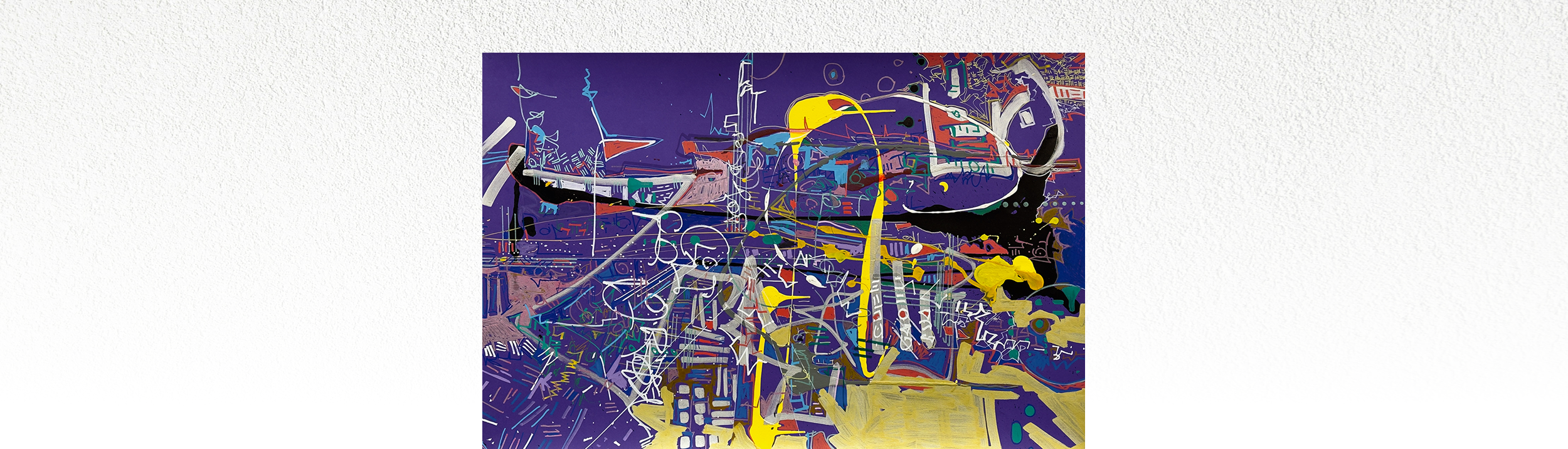A layered mixed media composition dominated by a saturated purple ground, intersected by looping linear marks, architectural forms, blocks of yellow, teal, red, and black, and rhythmic surface notation. Exhibited at Minneapolis Community and Technical College, School of Design and the Arts. Unframed. Certificate of Authenticity included.