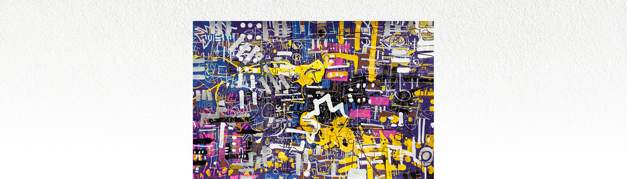 A horizontally oriented mixed media composition layered across a saturated purple ground, featuring dense linear scaffolding, repeated rectangular forms, looping white passages, and concentrated fields of yellow, black, pink, blue, and silver-gray mark making. Exhibited at Minneapolis Community and Technical College, School of Design and the Arts. Unframed. Certificate of Authenticity included.