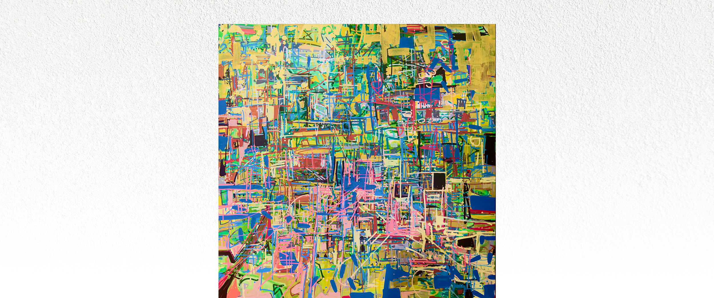 The composition resists rest. Marks overlap without settling. Color fields push against one another, creating a sense of electrical charge and visual overload. The painting reads as a transmission map rather than a destination, documenting what happens when information, memory, and emotion arrive faster than they can be processed.