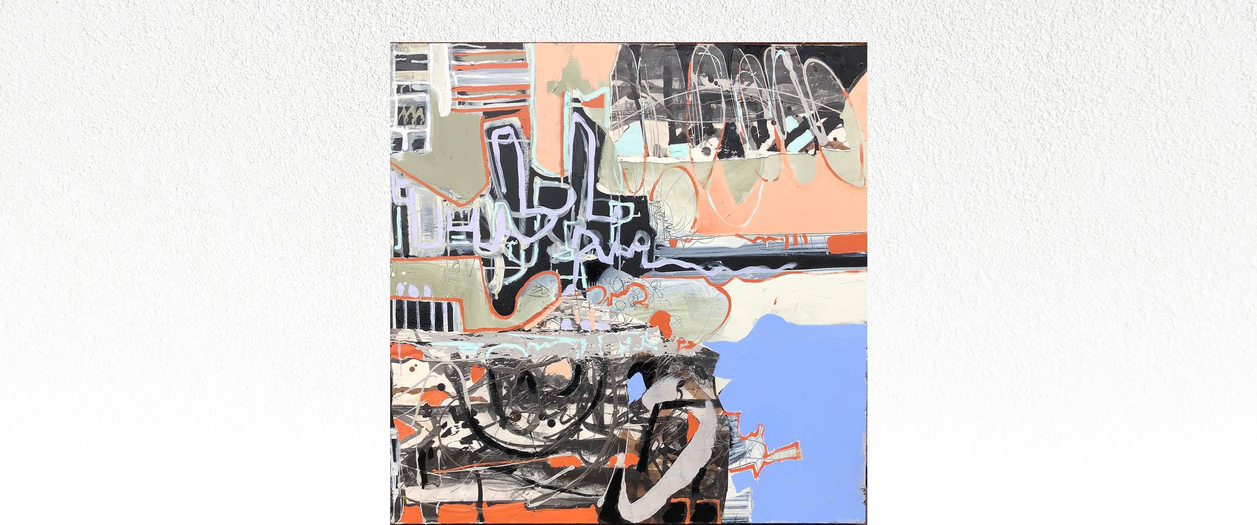 A horizontally layered mixed-media composition built from sage, peach, black, slate blue, and cream fields, intersected by looping linear marks, scraped textures, and dense gestural passages. Currently exhibited in Mending in Time at Mill City Clinic. Previously exhibited in Out of The Darkness and First of Many Steps Back. Unframed. Certificate of Authenticity included.