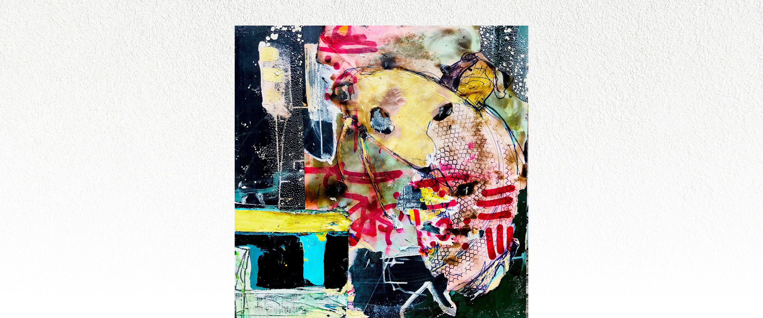 A charged, textural abstraction blending mythology, gesture, and layered collage. Exhibited in First of Many Steps Back. Unframed. Certificate of Authenticity included.