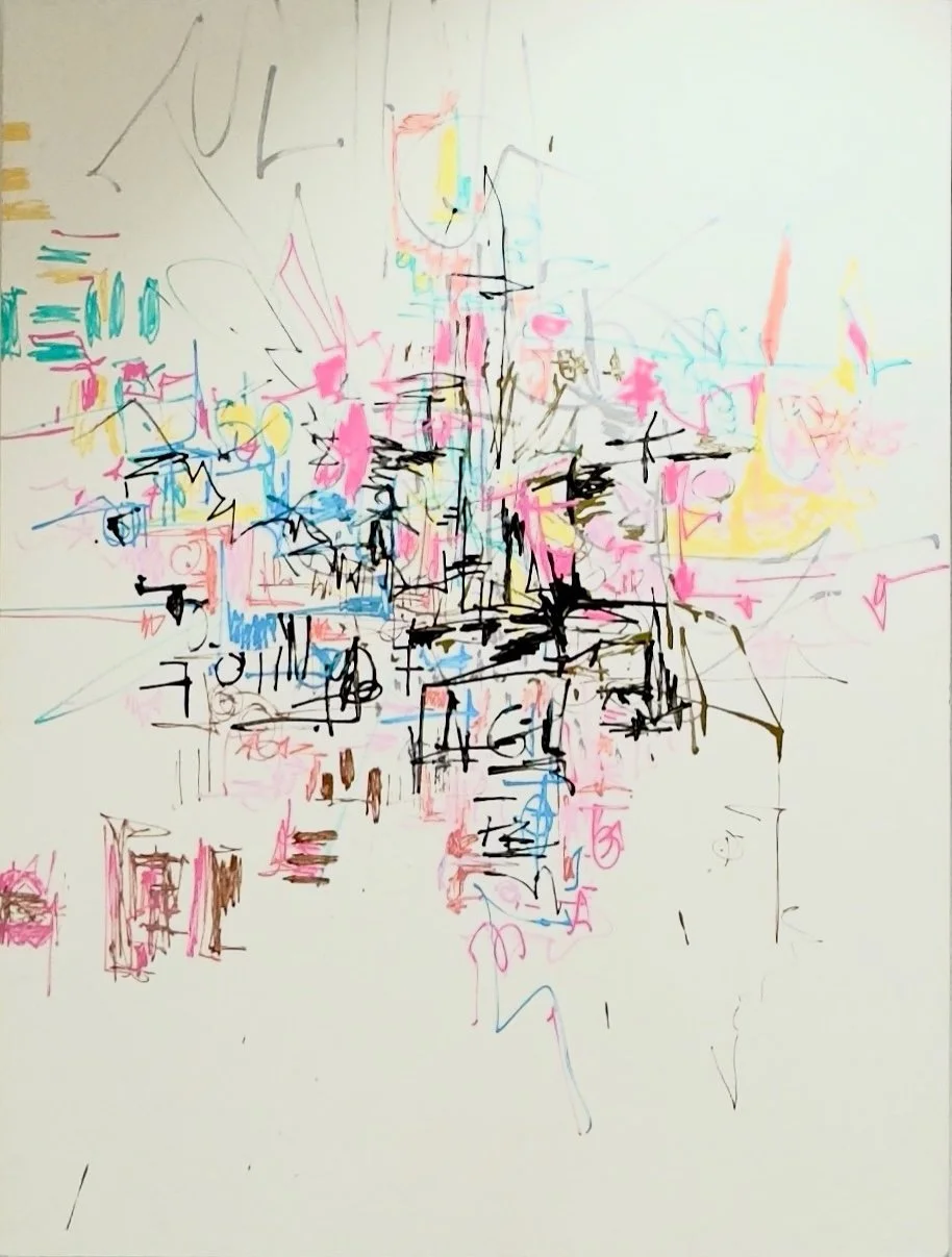 Neo-Khemetian Express Street Hieroglyph #2 unfolds as a delicate, atmospheric composition, where pastel hues and fine linear gestures converge into a loose architectural core. The marks feel transient and weightless, drifting across the surface in layered clusters that suggest both coded notation and evaporating structures. The openness of the surrounding space heightens the piece’s ephemeral quality.