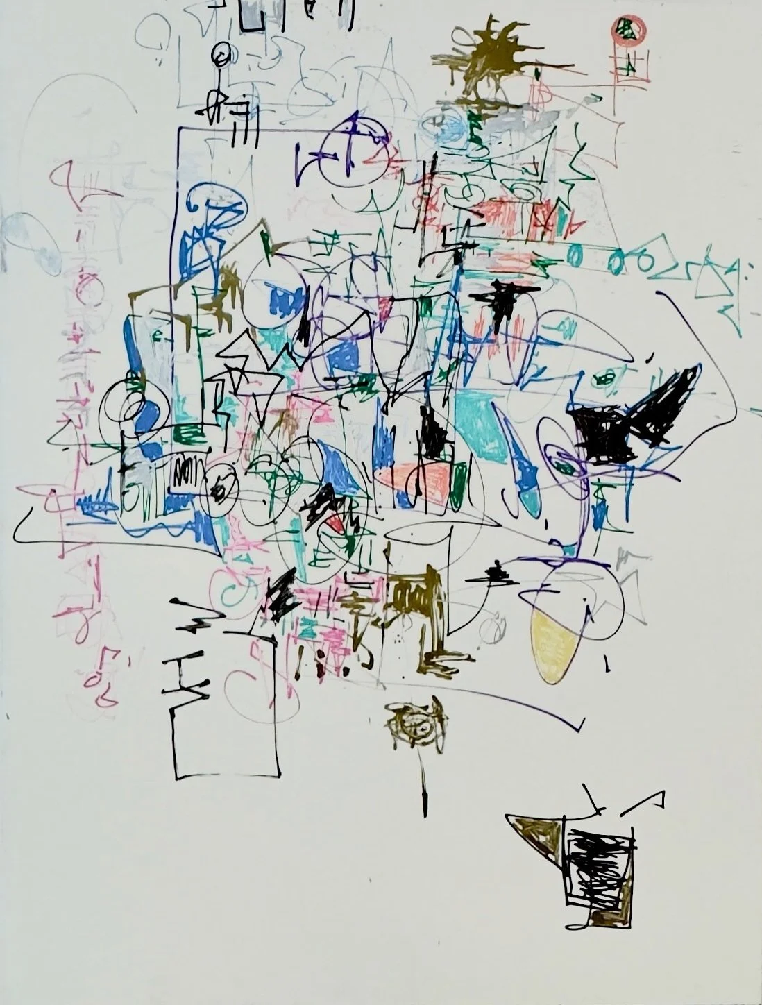 Neo-Khemetian Express Street Hieroglyph #3 presents an energetic and intricate network of layered symbols, vivid chromatic accents, and gestural notations tightly clustered in the center of the composition. The marks overlap and fracture into multiple directions, creating the sensation of an active, coded interface. Surrounding negative space allows the dense core to breathe, amplifying its architectural and diagrammatic presence.