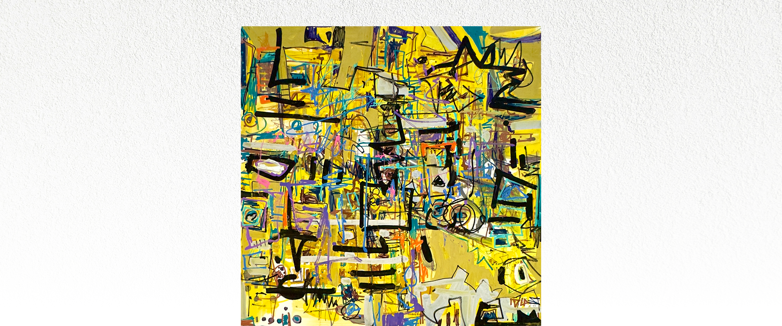 RAPS is a bold, high-energy mapping of color, signal, and coded geography. A radiant yellow field anchors the composition, while black structural lines, turquoise routes, and neon pink and purple marks build a layered visual field that reads like an urban diagram rewritten by intuition. Gesture-rich pathways zig, loop, and intersect, echoing the navigational noise of contemporary life.