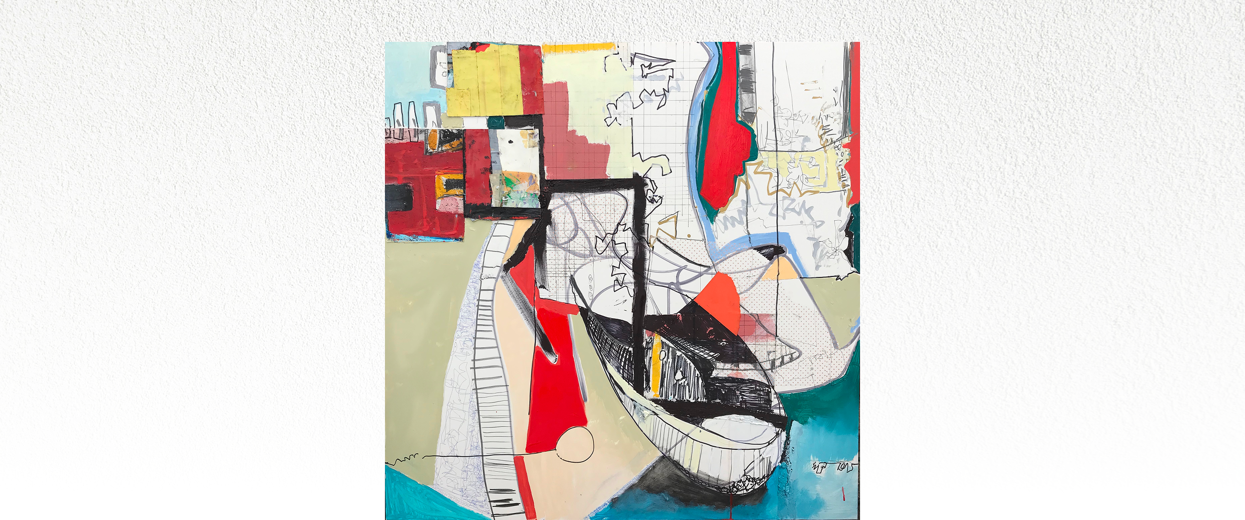 A layered mixed-media composition built from intersecting geometric blocks, exposed grid structures, linear drawing, and saturated red, teal, cream, and black passages, balancing dense mark-making with open spatial breaks. Currently exhibited. Previously exhibited in First of Many Steps Back and VĪRYA – Of the Messenger. Unframed. Certificate of Authenticity included.