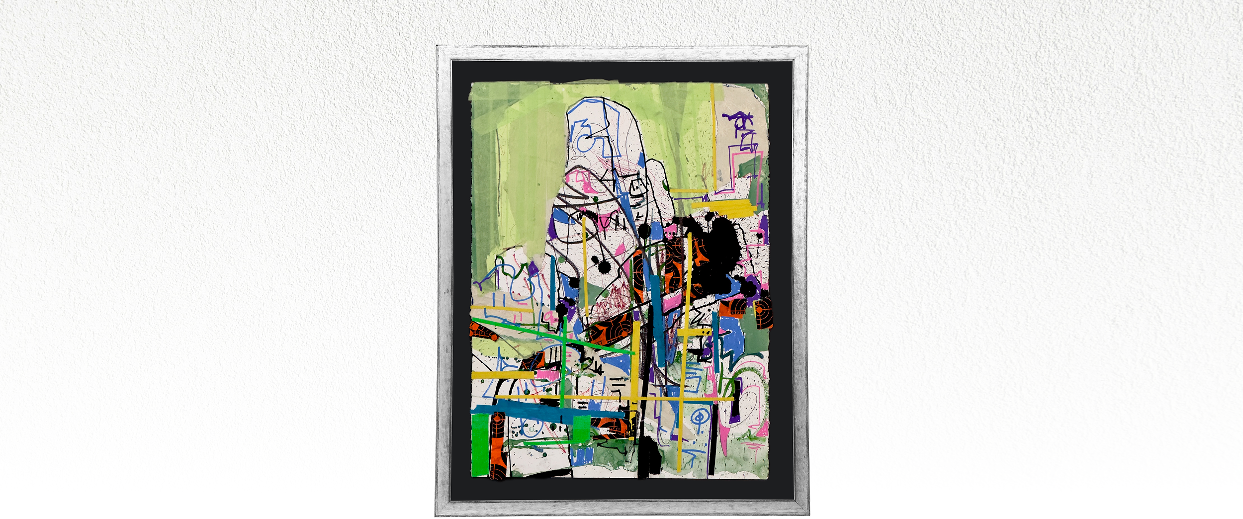 Street Glyph #12 blends a softly layered green background with bold black gestures, neon color fragments, and a loosely constructed central form that suggests a figure or monument. Lines, grids, and symbolic markings intersect across the surface, creating an active visual field where structure and improvisation meet. The collage elements add texture and depth, contributing to a sense of dimensional movement.
