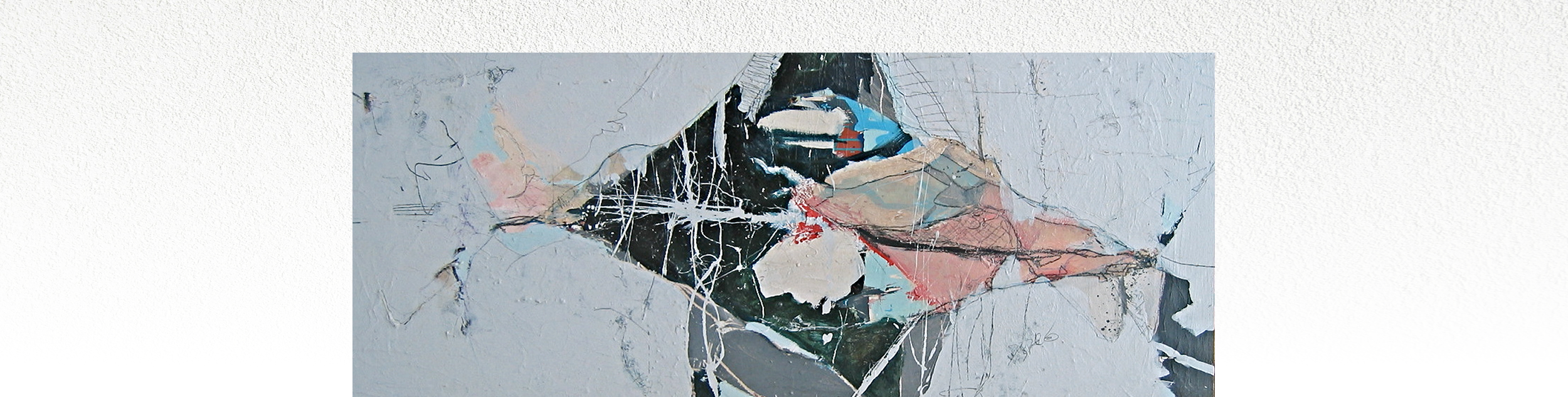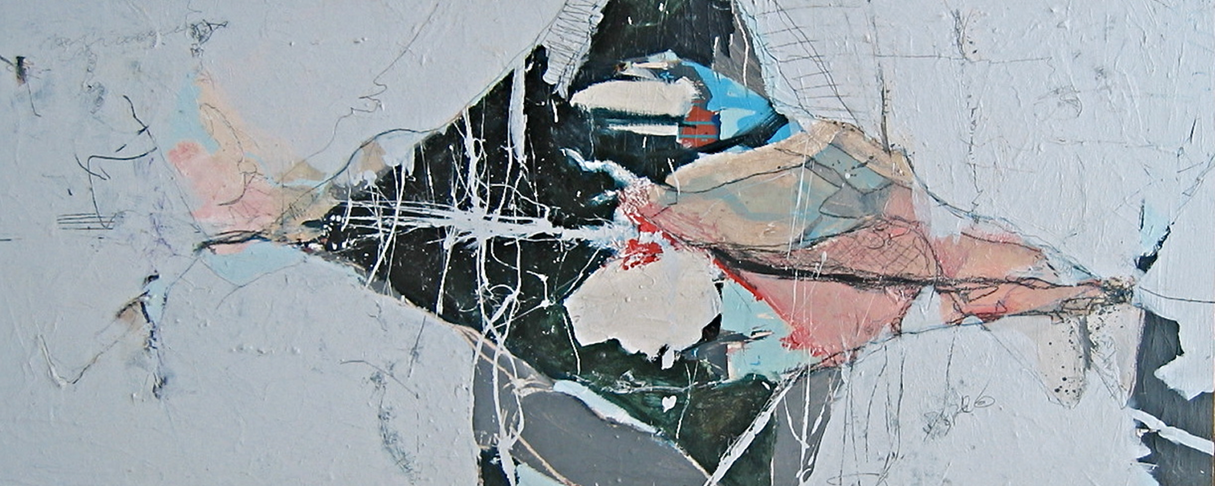 A muted field of near white and pale gray frames a sharp, crystalline center composed of layered blacks, blush pinks, slate blues, and soft neutrals. Fine white gesture lines scatter across the core like signals, fractures, or held energy. The structure feels suspended and weightless, yet emotionally charged, as if a moment of internal rupture or clarity is unfolding.