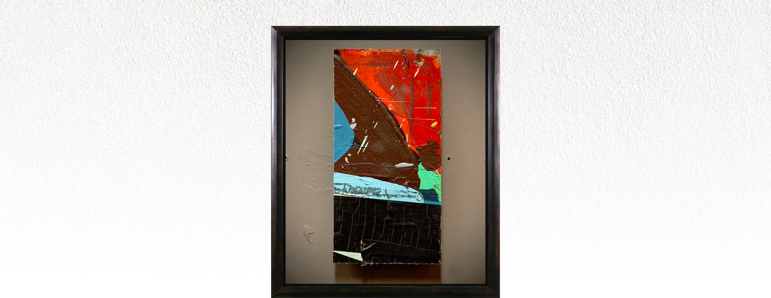 The Swimmer is a compact work from Gregory’s Cinderblock Series, reflecting a focused, material-driven approach at an intimate scale. The piece emphasizes surface interaction and color tension, positioning it as an accessible entry point into a body of work that distills larger compositional ideas into small, framed panels.